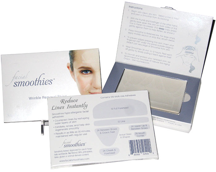 Facial Smoothies are adhesives that are shaped for specific areas of the face that help “iron-out” your skin.  Apply them and leave on for 20 minutes or overnight.  For deeper wrinkles it is suggested to wear them overnight as the longer you wear it the better the results.  They are hypoallergenic strips and the reason they help is because it smooths the skin and the retraining action of the strips holding your skin in a smooth position.